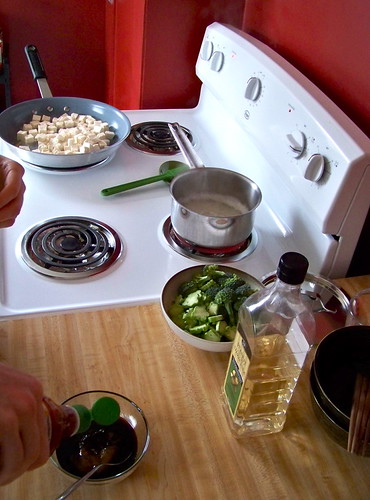This recipe arose out of necessity, when the only vegetable we could get in the winter that was half decent was broccoli, and the only protein we could afford was a block of tofu or a thin frying steak that cost two dollars.
